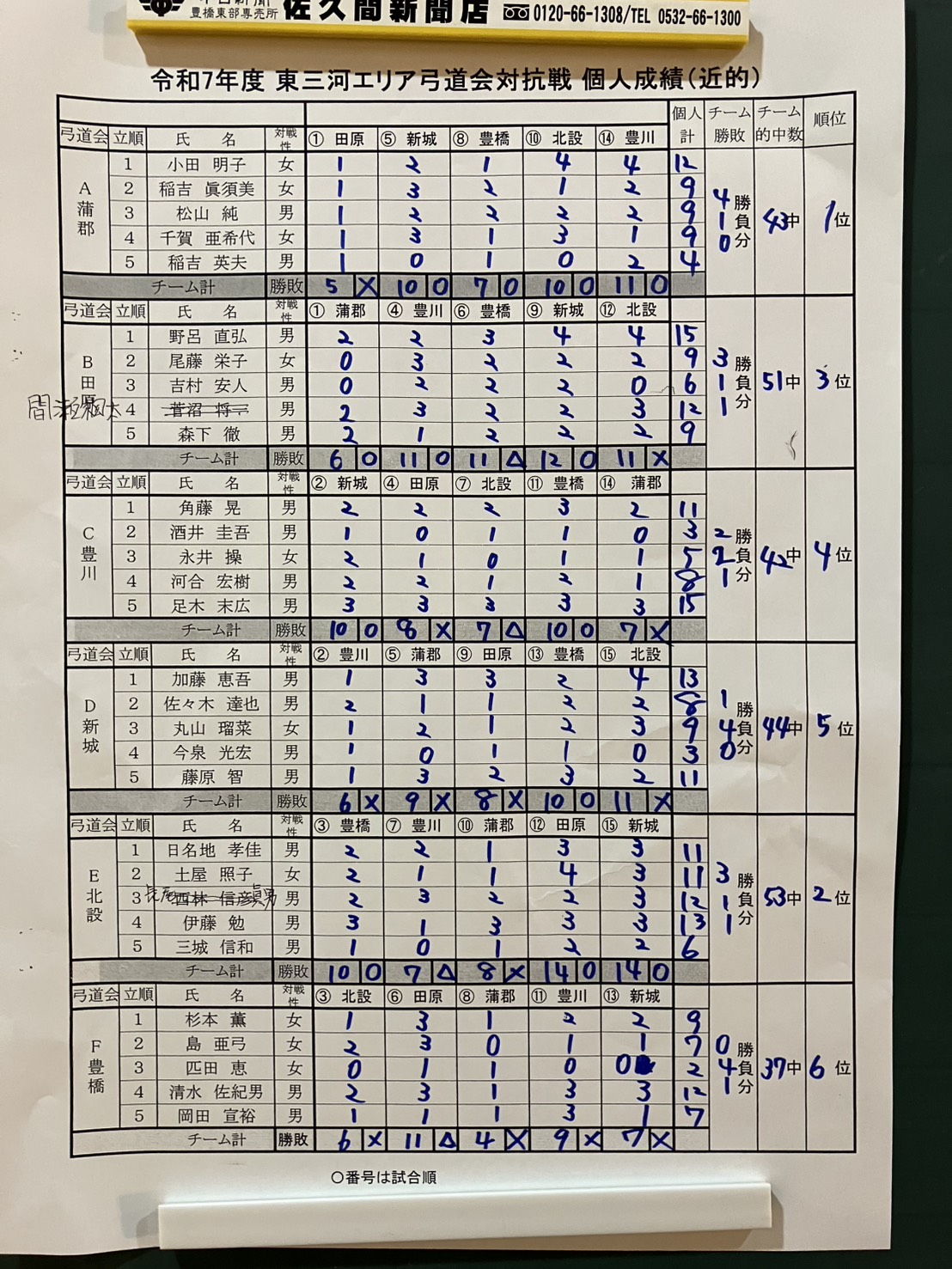 個人戦の結果は団体予選の合計的中数により順位を決定する